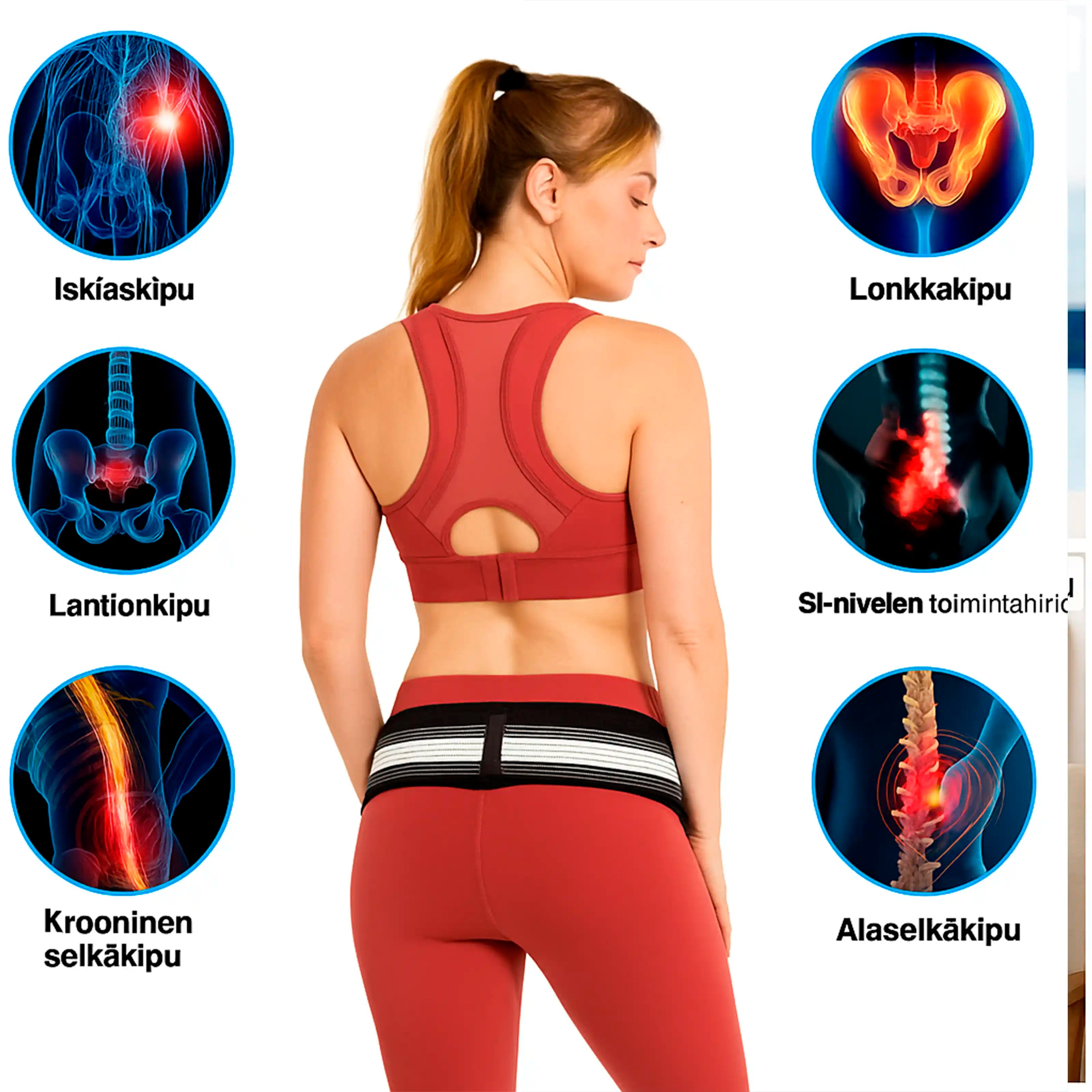 AsenCare™ Selkävyö auttaa lievittämään useita yleisiä kiputiloja – kuten iskiaskipua, lonkkakipua, lantion kipua, SI-nivelen toimintahäiriöitä ja kroonista alaselkäkipua – tukemalla selkärangan luonnollista asentoa ja vähentämällä painetta hermoihin.
